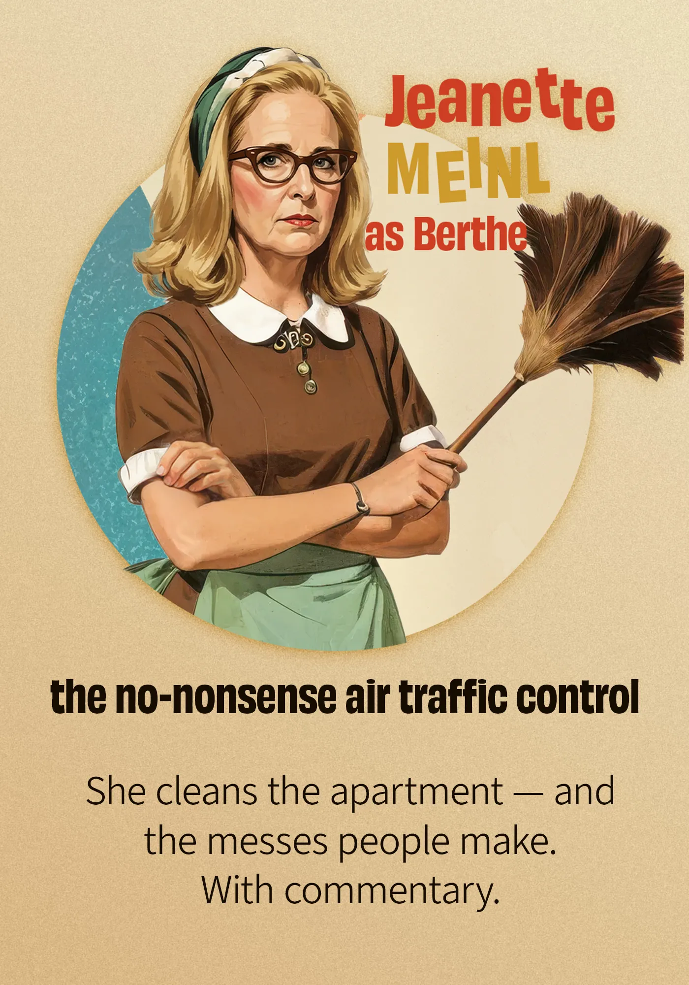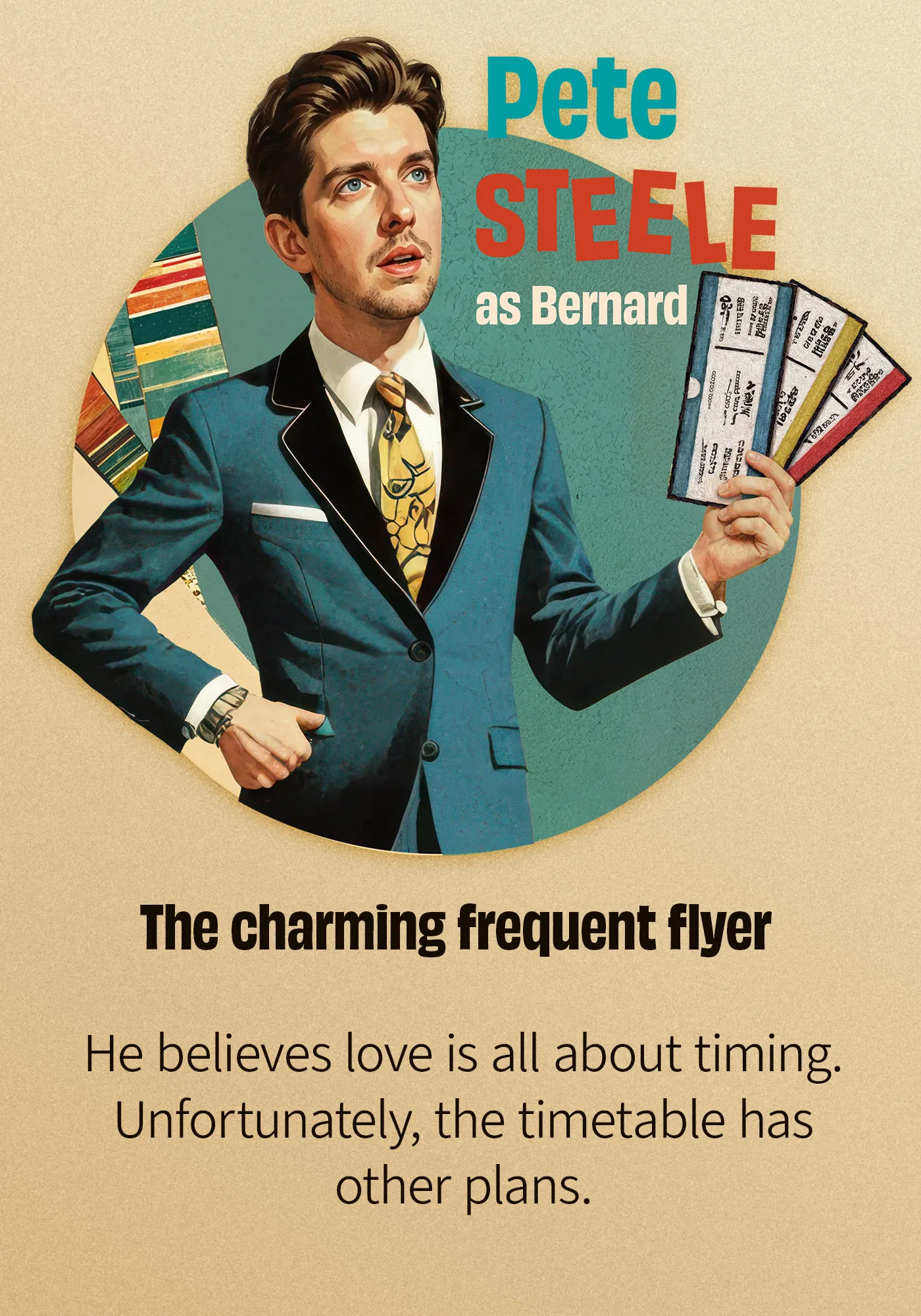 I went full 60s retro for this one — inspired by early aviation commercials — and adapted an acrylic-like illustrative style (flat shading, strong character, patterned texture). The play itself is pure door-slamming chaos: lightning-fast exits, near-misses, and escalating farce, so the visuals needed that same charming velocity.