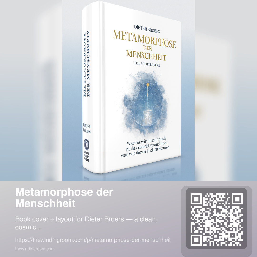 Cover and layout work for Metamorphose der Menschheit (Dieter Broers), designed around a calm, high-contrast system: bright space, crisp typography, and a slightly “cosmic” atmosphere that stays readable from thumbnail to print.