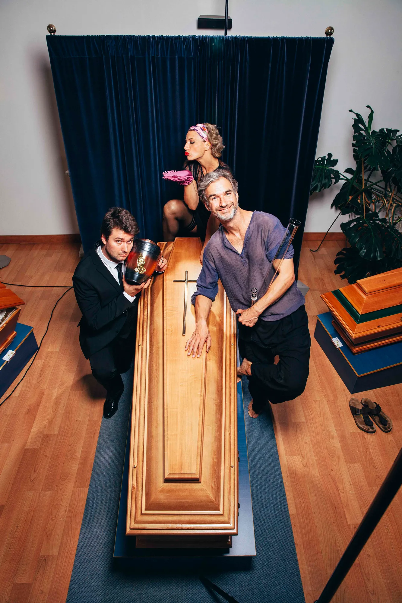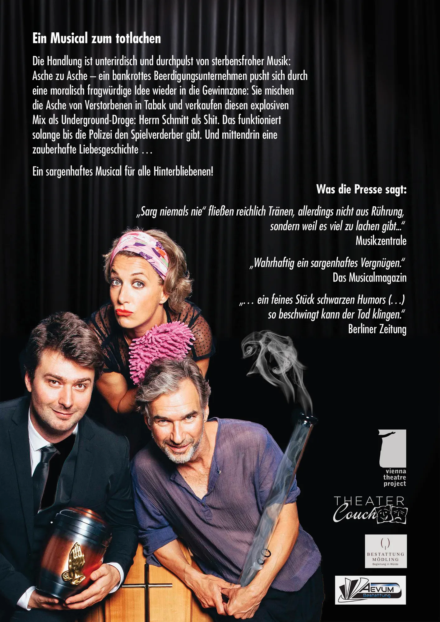 The piece is a musical. and a funny one as well. What is funny about death? Nothing at all. Unless you work at the Schneider funeral home. There you can only endure it with humor - with black humor. Since the death of his father, David has had to run the bankrupt family business alone. Only the Polish domestic helper Dakmar stands by him. His older brother Tim ran away from the family eight years ago to study the Kama Sutra in India. Now Tim is broke and comes back home to pick up his inheritance. But there is no inheritance. David, Dakmar and Tim urgently need money - an idea is needed. By mistake, the three smoke the ashes of a deceased person. Mr. Schmitt turns out to be the best drug of all time. Tim has the idea to sell the stuff: Mr. Schmitt as shit. Business is going splendidly until the police find out about the machinations of the three hobby dealers. A coffin-like musical for all the bereaved.