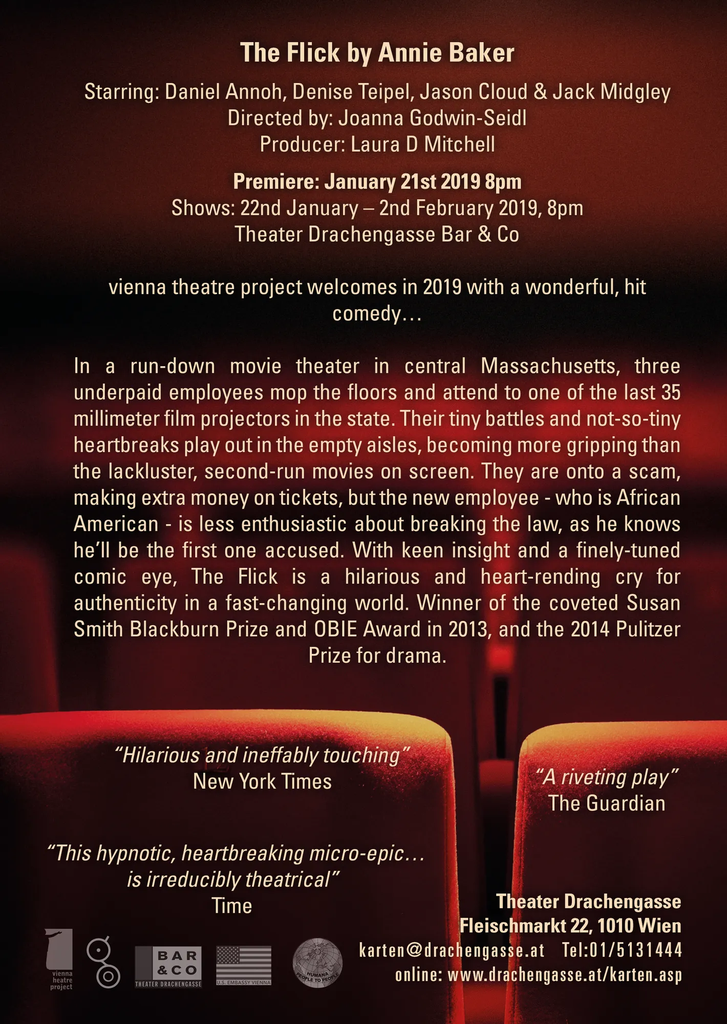 The show takes place in a run-down movie theater in central Massachusetts, three underpaid employees mop the floors and attend to one of the last 35 millimeter film projectors in the state. Their tiny battles and not-so-tiny heartbreaks play out in the empty aisles, becoming more gripping than the lackluster, second-run movies on screen. They are onto a scam, making extra money on tickets, but the new employee - who is African American - is less enthusiastic about breaking the law, as he knows he’ll be the first one accused. With keen insight and a finely-tuned comic eye, The Flick is a hilarious and heart-rending cry for authenticity in a fast-changing world. Winner of the coveted Susan Smith Blackburn Prize and OBIE Award in 2013, and the 2014 Pulitzer Prize for drama.